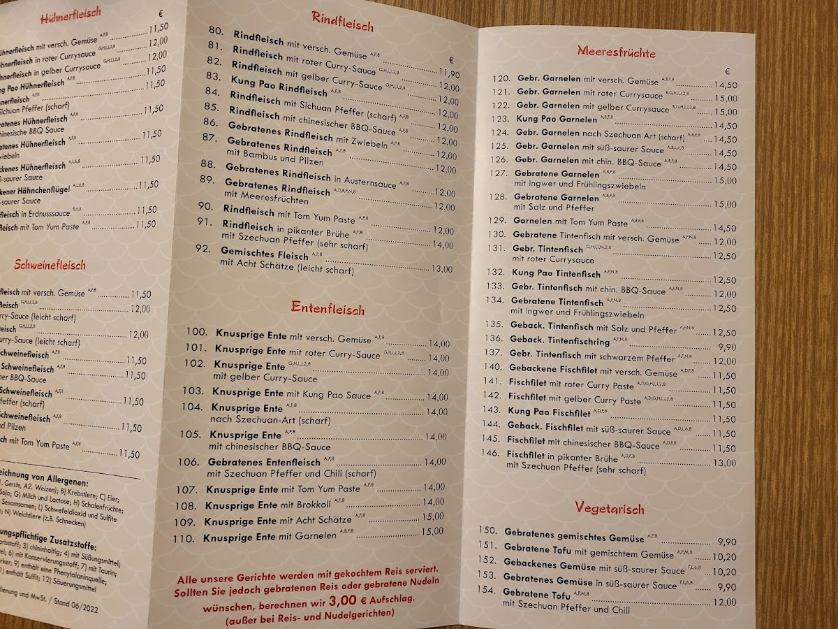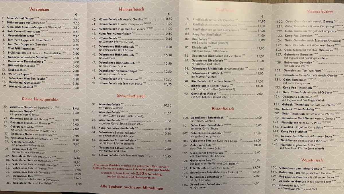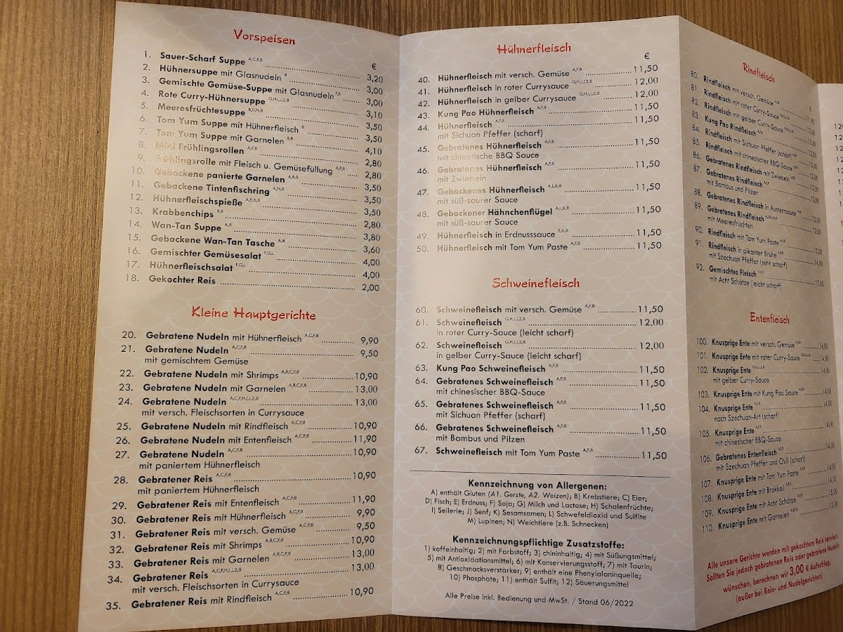 Overall, the menu at China Wok Fuxing Restaurants presents a satisfying blend of familiar Asian-inspired comfort dishes with a few standout specialties that leave a lasting impression. The Thai Suppe offers a warm and aromatic start, balancing light spice with a pleasant depth of flavor that sets the tone for the meal. Among the mains, the Gebackenes Entenfleisch 8schätze stands out as a highlight, combining crispy duck with a rich assortment of ingredients that create both texture and variety in every bite. The menu feels approachable yet diverse enough to cater to different tastes, making it suitable for both quick casual dining and more indulgent meals. Portions are generous, and the flavors, while not overly complex, are consistently enjoyable and well-executed, making the overall dining experience reliable and satisfying.